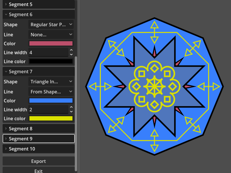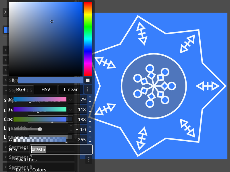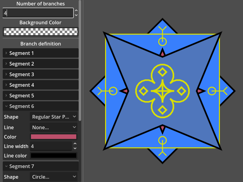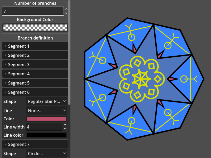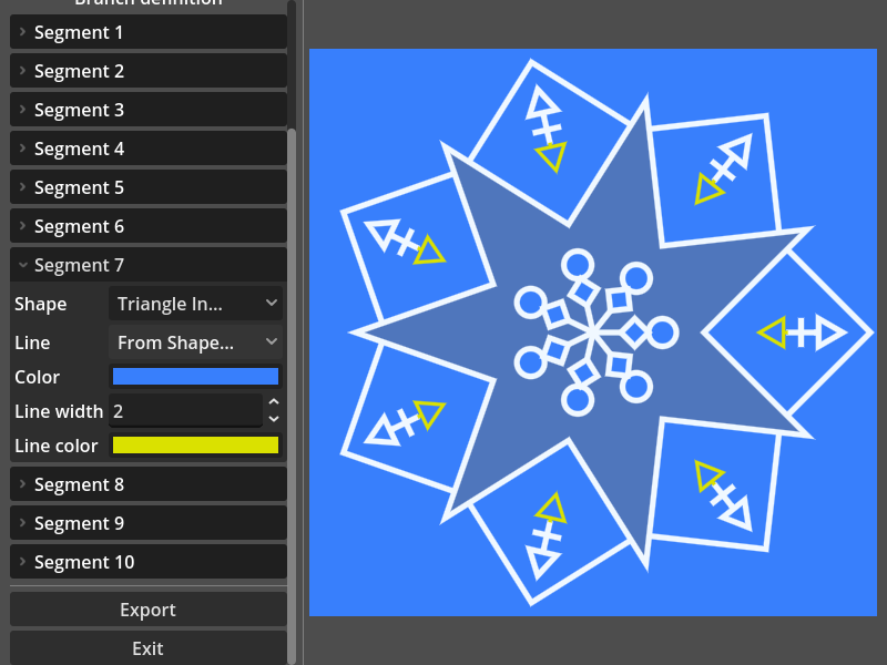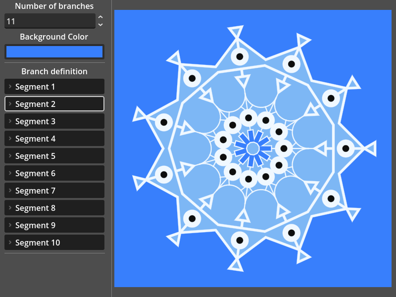 Snowflake is a tool for making shapes with radial geometry (snowflakes, stars, flowers, ...) from the description of a branch of the shape. A branch is divided into ten segments with several parameters defining the shape that appear at the segment's position and its colors.